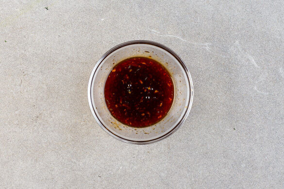 Die Sojasauce mit 2–3TL Limettenschale, dem Knoblauch und der Sweet-Chili-Sauce zu einem Dressing verrühren.
