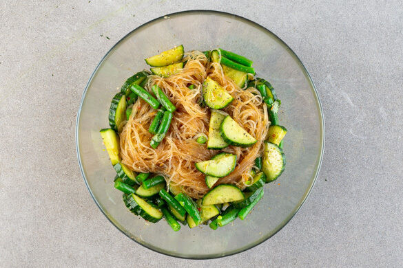 Heute zauberst du im Nu einen asiatischen Glasnudelsalat mit würzigen Tofustreifen und knackigen grünen Bohnen. Frische Kräuter und Gurke, geröstete Erdnüsse und ein aromenstarkes Dressing aus Soja- und Sweet-Chili-Sauce mit Knoblauch und Limette ergänzen das lecker-leichte Mahl. Guten Appetit!