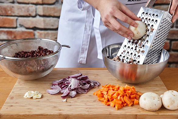Mittleren Topf mit ausreichend gesalzenem Wasser zum Kochen bringen. Zwiebeln und den Knoblauch schälen, halbieren und in feine Streifen schneiden. Pilze mit Küchenkrepp oder einer Pilzbürste von evtl. Dreck befreien und mit der groben Seite der Küchenreibe reiben. Bohnen abtropfen lassen. Karotten schälen und grob raspeln.
