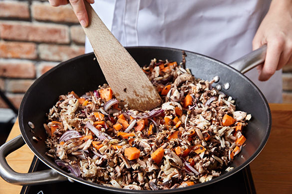 Den Ofen auf 220°C Grill vorheizen. Eine große Pfanne mit 1-2EL Öl hoch erhitzen und Zwiebel, Knoblauch, Karotten und Pilze darin für ca. 5-7Min. braten. Mit Salz und Pfeffer würzen.
