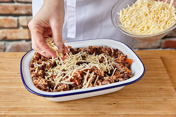Den Reisauflauf schließlich mit dem Reibekäse bestreuen und für ca. 10-12Min. goldbraun überbacken.