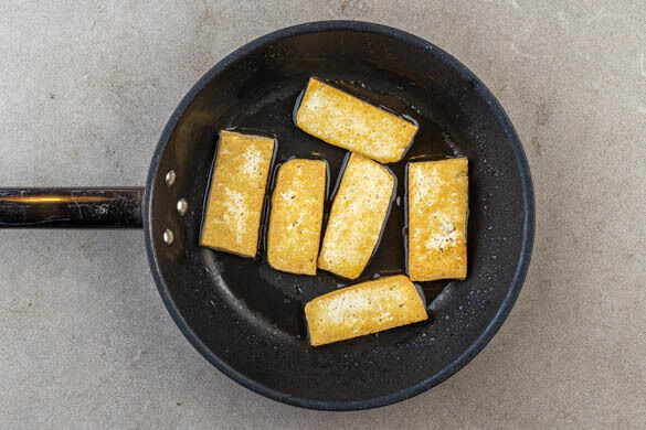Den Tofu in ca. 1cm breite Scheiben schneiden. In einer großen Pfanne mit 1½EL Pflanzenöl bei mittlerer Hitze in 2–3Min. rundum goldbraun braten. Inzwischen den restlichen Knoblauch fein würfeln und mit 3EL Mayonnaise und 1EL Wasser verrühren. Mit Salz und Pfeffer abschmecken.