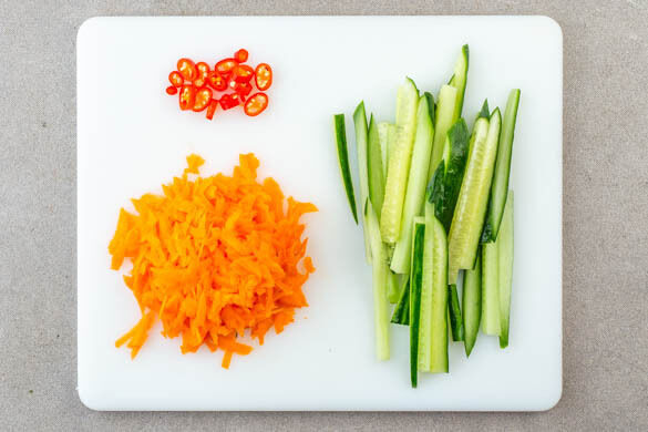 Den Backofen auf 220°C (200°C Umluft) vorheizen. Die Gurke quer halbieren, dann längs in dünne, ca. 1cm breite Spalten schneiden. Die Karotte ggf. schälen und grob raspeln. Die Chilischote in feine Ringe schneiden.