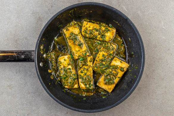 Die Pfanne vom Herd nehmen und den Tofu mit der Zitronengrassauce vermengen, bis der gesamte Tofu mit Sauce überzogen ist.