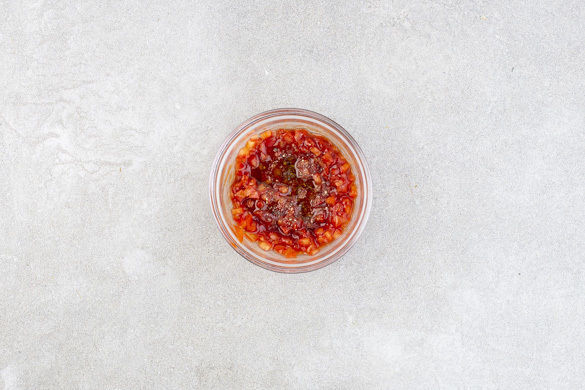 Die Tomatenwürfel mit 2EL Ketchup vermengen und mit einigen Tropfen Trüffelöl verrühren. Mit Salz und Pfeffer sowie ggf. mehr Trüffelöl abschmecken.
