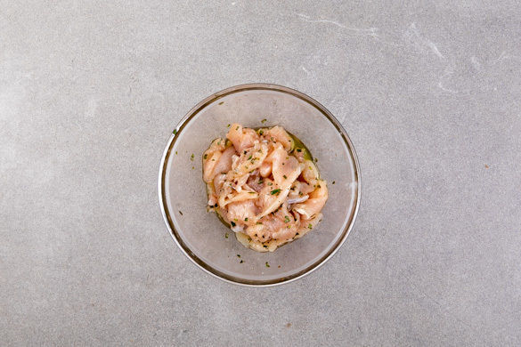 Das Fleisch mit etwas Küchenkrepp trocken tupfen und in möglichst dünne Streifen schneiden. Den Rosmarin mit 1–2EL Olivenöl verrühren und das Fleisch mit dem Rosmarinöl vermengen.