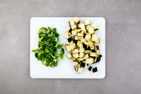 Die Paprika vierteln, entkernen und in ca. 1cm kleine Würfel schneiden. Die Aubergine ebenfalls ca. 1cm klein würfeln.