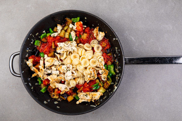 Das Fleisch in einer großen Pfanne 1–2Min. scharf anbraten. Die Zwiebeln, die Auberginen und die Paprika dazugeben und 2–3Min. mitbraten. Den Knoblauch und die gehackten Tomaten unterrühren, dann den Brühwürfel hineinbröseln und alles 4–5Min. köcheln lassen. Ggf. etwas Wasser zugeben. Die Pasta untermengen, mit Salz und Pfeffer würzen und mit dem Käse servieren.