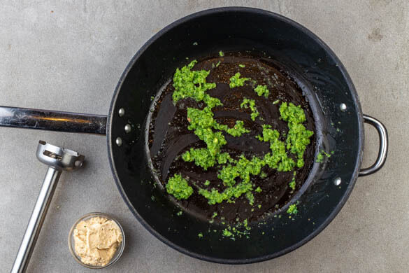 Die Currypaste mit 3EL Pflanzenöl in die Pfanne geben und bei mittlerer Hitze unter gelegentlichem Rühren ca. 5Min. anbraten. Die Cashews in ein Sieb abgießen, mit 50ml Wasser in das hohe Gefäß geben und mit dem Stabmixer möglichst glatt pürieren.