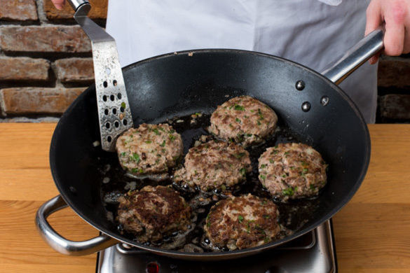 Die Bouletten in einer großen Pfanne mit 1–2EL Pflanzenöl bei mittlerer Hitze auf jeder Seite ca. 4Min. braten, bis die Bouletten durch sind. Aus der Pfanne nehmen und warm halten. Die Pfanne mit etwas Küchenkrepp auswischen.