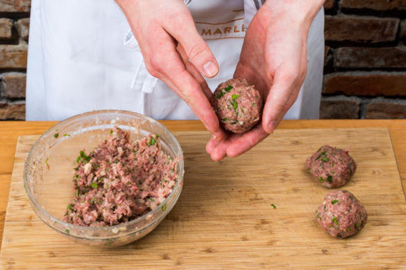 Das Hackfleisch mit den Zwiebeln, den Semmelbröseln, der Petersilie, dem Senf sowie Salz, Pfeffer und 1 Prise Muskat vermengen, zuletzt 1 Ei untermischen. Tipp: Wer mag, kann etwas Petersilie zum Garnieren beiseitelegen. Die Hackfleischmasse in ca. 8 gleich große Kugeln portionieren und diese zu Bouletten formen.