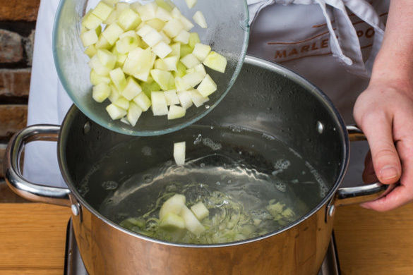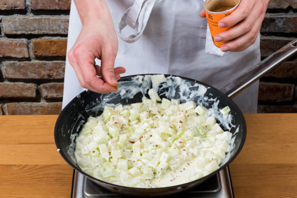 In einem großen Topf ausreichend Wasser für den Kohlrabi bzw. die Kartoffeln zum Kochen bringen. Den Kohlrabi schälen und in ca. 1cm große Würfel schneiden. Die Kartoffeln schälen und je nach Größe halbieren oder vierteln. Die Zwiebel schälen, halbieren und in sehr feine Würfel schneiden.