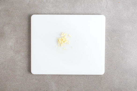 Die Backbleche in den Backofen geben und den Ofen auf 230°C Umluft vorheizen. Den Knoblauch schälen in feine Würfel schneiden. Tipp: Wer keinen Umluftofen hat, kann die Pizzen auch nacheinander bei 250°C Ober-/Unterhitze backen.
