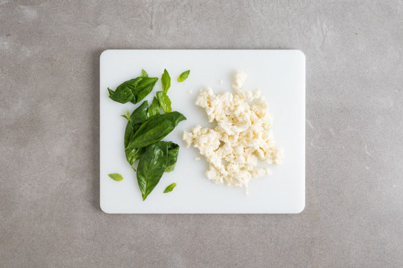 Die Mozzarellas mit den Fingern in kleine Stücke zerzupfen. Die Basilikumblätter von den Stängeln zupfen.