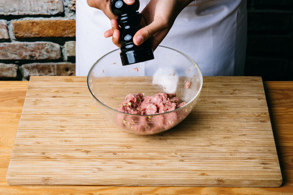 Das Hackfleisch mit den weißen Lauchzwiebeln, der Chilisauce, ca. 1/2TL Salz und Pfeffer nach Geschmack würzen.