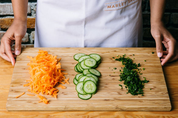 Die Karotte schälen und mit einer Küchenreibe grob raspeln. Die Gurke in dünne Scheiben schneiden. Den Koriander samt Stängeln fein schneiden.