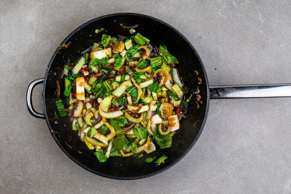 Den weißen Teil des Pak Choi, die Zwiebeln, den Knoblauch und den Ingwer mit der Sojasauce in der Pfanne 1–2Min. bei mittlerer Hitze anbraten. Anschließend abgedeckt bei mittlerer bis niedriger Hitze 3–4Min. garen. Die Lauchzwiebel in feine Ringe schneiden.