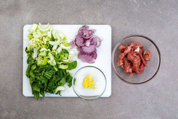 Das Fleisch mit etwas Küchenkrepp trocken tupfen und mit Salz und Pfeffer würzen. Den weißen und grünen Teil des Pak Choi getrennt voneinander in Streifen schneiden, den Strunk entfernen. Die Zwiebel schälen, halbieren und in feine Ringe schneiden. Den Knoblauch und den Ingwer schälen und fein reiben.