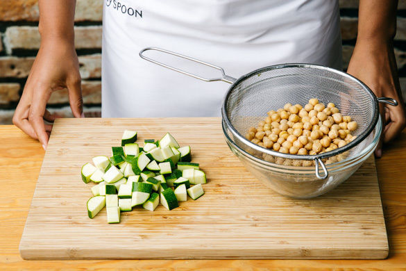 Die Kichererbsen in ein Sieb abgießen, mit kaltem Wasser abspülen und abtropfen lassen. Die Zucchini längs vierteln und in ca. 1cm kleine Stücke schneiden.