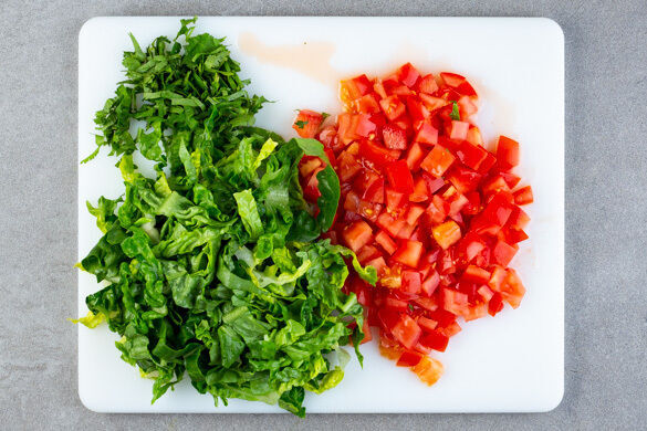 Die Korianderblätter fein schneiden. Die Tomaten in ca. 1cm große Würfel schneiden, dabei den Strunk entfernen. Den Salat in ca. 1cm breite Streifen schneiden.