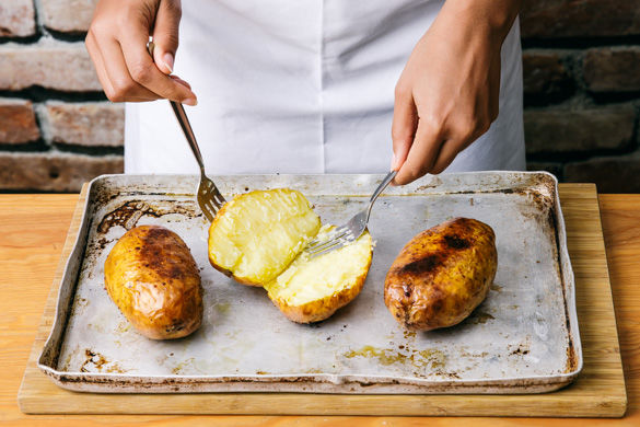 Den Backofen auf 220°C Umluft (240°C Ober-/Unterhitze) vorheizen. Die Kartoffeln mit einer Gabel mehrmals einstechen und 50–55Min. backen, bis sich die Gabel ohne Widerstand in die Kartoffel einstechen lässt. Die Kartoffeln nach der Hälfte der Backzeit einmal wenden. Tipp: Die Kartoffeln können alternativ in ca. 15Min. in der Mikrowelle gegart werden.