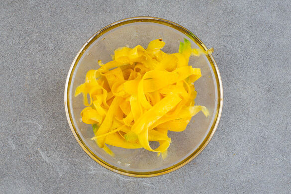 2EL hellen Essig gründlich mit 1TL Zucker und 1 Prise Salz verrühren. Die Karotte ggf. schälen und mit einem Sparschäler in breite Streifen schneiden. Den Einlegesud vorsichtig in die Karottenstreifen einmassieren.