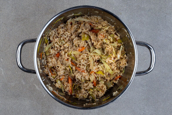 Den Reis in einem Sieb kalt abspülen, bis das Wasser klar bleibt, dann in den Topf zu dem Gemüse geben. Die Zwiebelmarmelade einrühren und das kochende Wasser angießen. Den Reis aufkochen und abgedeckt bei niedriger Hitze 18–20Min. kochen, bis das Wasser aufgesogen und der Reis gar ist, dabei gelegentlich umrühren. Noch ca. 5Min. ohne Hitzezufuhr ziehen lassen.