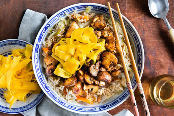 „Umami“ bedeutet im Japanischen so viel wie „Schmackhaftigkeit“. Genau das bekommst du heute auf deinen Teller: Champignons und Schweinehackfleisch dürfen nämlich in einem ganzen Arsenal aromatischer Gewürze braten, und Misopaste bringt noch mehr Umami-Schwung mit ins Spiel. Auf fluffig klebrigem Sushireis mit bereits vorgeschnipseltem asiatischem Gemüse und süßsauer eingelegten Möhrenstreifen serviert ein Genuss!