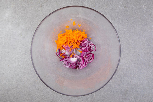 Die Karotte schälen und mit einer Küchenreibe grob raspeln. Die Zwiebel schälen, halbieren und in feine Streifen schneiden. Den Ingwer schälen und fein reiben.
