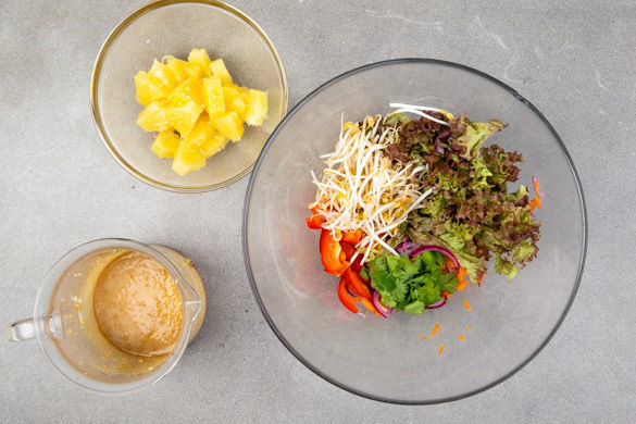 Wir sind verliebt in diesen Thai-Salat, der eine wahre Geschmacksbombe ist! Probier es aus und verfalle auch du der tollen Mischung aus fruchtiger Ananas, gerösteten Cashews, einem knackigen Gemüsemix aus Karotte, Paprika, Sprossen und roter Zwiebel sowie köstlichem Tofu und aromatischem Koriander.