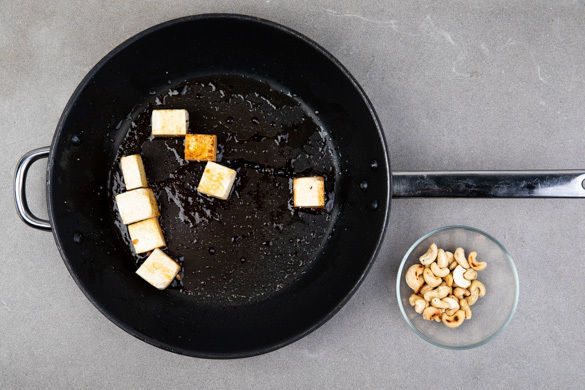 Die Cashews in einer mittelgroßen Pfanne bei mittlerer Hitze ohne Zugabe von Fett ca. 2Min. goldgelb anrösten. Vorsicht, die Cashews können schnell verbrennen. Zum Abkühlen herausnehmen. Den Tofu in derselben Pfanne mit 1EL Pflanzenöl 1–2Min. anbraten. Mit der 1/2 der Sojasauce ablöschen und noch 3–5Min. braten, bis der Tofu schön kross ist. Mit Salz und Pfeffer würzen.