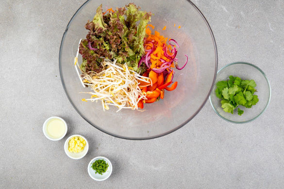 Die Paprika halbieren, entkernen und in kleine Würfel schneiden. Mit den Karottenraspeln, den Zwiebeln, den Mungbohnensprossen und dem gemischten Salat vorsichtig vermengen. Die Korianderblätter von den Stängeln zupfen, die 1/2 der Blätter fein schneiden und ebenfalls untermischen. Die Limetten halbieren und auspressen.