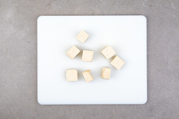 Den Tofu mit etwas Küchenkrepp trocken tupfen und in ca. 2cm große Würfel schneiden. Die Ananas in ein Sieb abgießen und abtropfen lassen.