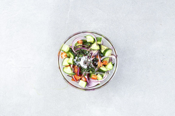 Die Tomaten in kleine Würfel schneiden. Die Gurken längs vierteln und ebenfalls in kleine Würfel schneiden. Mit der Petersilie, den restlichen Zwiebeln und 2EL Olivenöl vermengen. Den Salat mit der restlichen Zitronenschale, dem restlichen Zitronensaft und Salz und Pfeffer nach Geschmack würzen. Die Köfte mit dem Hummus und dem Salat anrichten und servieren.