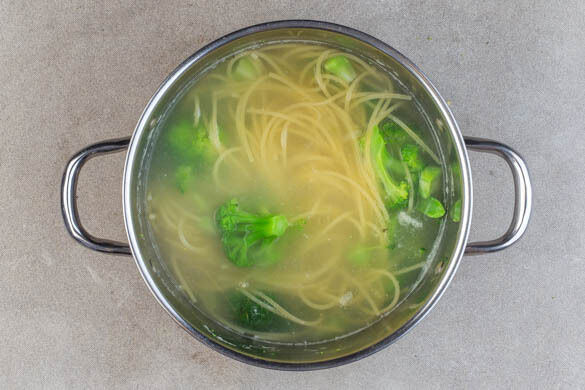 Die Pasta in das kochende Wasser geben und ca. 2Min. kochen. Den Brokkoli dazugeben und 5–7Min. mitkochen, bis die Pasta und der Brokkoli gar sind. In ein Sieb abgießen und abtropfen lassen.