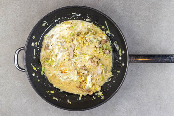 Sobald das Fleisch gar ist, auf mittlere Hitze reduzieren. Die Crème fraîche, 3EL Wasser und die ½ des Brühgewürzes einrühren und die Sauce 1–2Min. köcheln lassen.