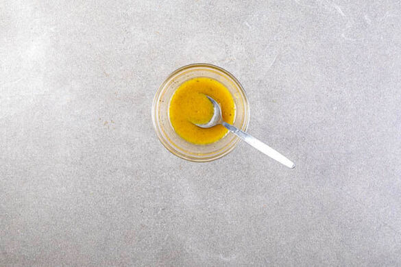 1EL Olivenöl mit 2TL Essig, 1TL Senf sowie 2EL Wasser zu einem Dressing verrühren und mit Salz und Pfeffer abschmecken.