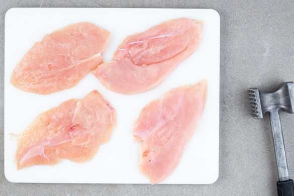 Die Fleisch trocken tupfen, jeweils in 2 gleich große Stücke schneiden und diese quer zu ingesamt 8 Schnitzeln halbieren. Die Schnitzel mit einem Fleischklopfer oder dem Boden einer schweren Pfanne ca. 0,5cm dünn plattieren.