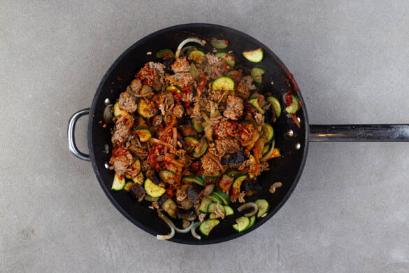 Die Zucchini, die Zwiebeln und das Hackfleisch zugeben und bei mittlerer bis starker Hitze unter Rühren ca. 3Min. mitbraten. Die Gewürzmischung, die ½ des Zimts und das Tomatenmark einrühren und alles weitere 2–3Min. braten.