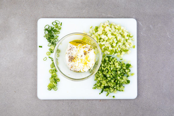Den grünen und den weißen Teil der Lauchzwiebel separat in feine Ringe schneiden. Die Zitronenschale abreiben, dann die Zitrone halbieren und auspressen. Den Apfel vierteln, entkernen, in kleine Würfel schneiden und mit der ½ des Zitronensafts marinieren. Die Gurke ebenfalls in kleine Würfel schneiden.