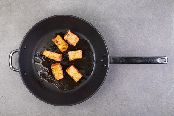 Den Lachs mit kaltem Wasser abspülen, trocken tupfen und in ca. 6 gleich große Stücke schneiden, dabei evtl. vorhandene Gräten und die Haut entfernen. Mit der ½ der Zitronenschale und 1EL Olivenöl einreiben.