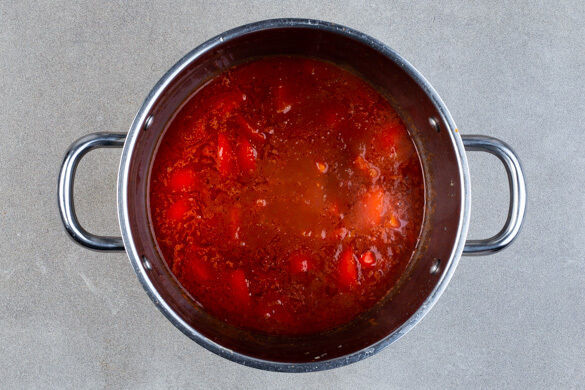 Das Gemüse mit den passierten Tomaten sowie 300ml warmem Wasser ablöschen, das Brühgewürz einrühren und die Suppe zum Kochen bringen.