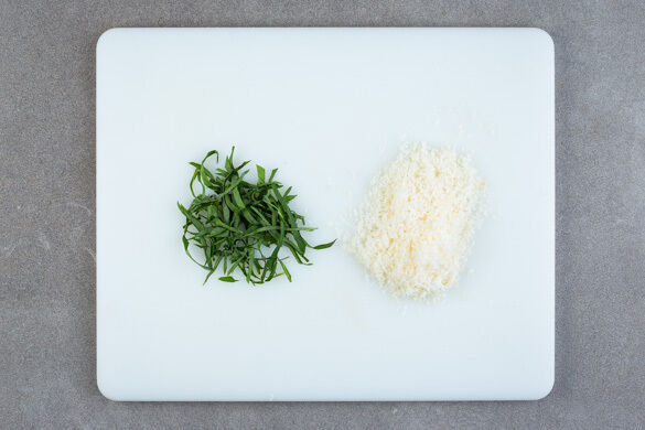 Den Käse fein reiben. Die Basilikumblätter von den Stängeln zupfen und fein schneiden.