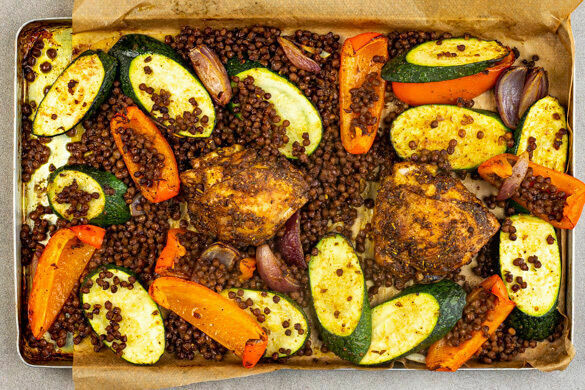 Unser Hähnchen bekommt heute eine ordentliche Abreibung – aber im guten Sinne! In der karibischen Küche bedeutet „Jerk-Style“ nämlich, sein Grillgut mit einer ellenlangen Liste von Gewürzen einzureiben, bevor es gebraten wird. Auch Zucchini, Paprika und Linsen bekommen eine gute Portion Geschmack mit auf den Weg in den Backofen. Serviert wird das Ganze mit einem frischen Orangen-Koriander-Dressing. Top!