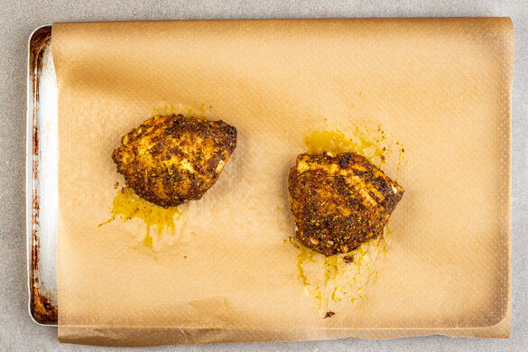 Das Fleisch auf einem mit Backpapier ausgelegten Backblech verteilen. Übriges Würzöl aufbewahren. Das Fleisch in den noch vorheizenden Ofen schieben und 10–15Min. backen, bis die Haut zu bräunen beginnt.