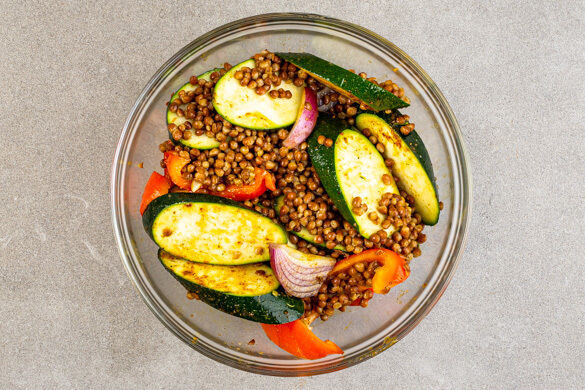 Die Paprika achteln und entkernen. Die Zucchini schräg in 2–3cm breite Scheiben schneiden. Die Zwiebel schälen, halbieren und eine Hälfte vierteln, die andere Hälfte beiseitelegen. Die Linsen in einem Sieb mit kaltem Wasser abspülen und abtropfen lassen. Alles mit dem übrigen Würzöl vermengen.