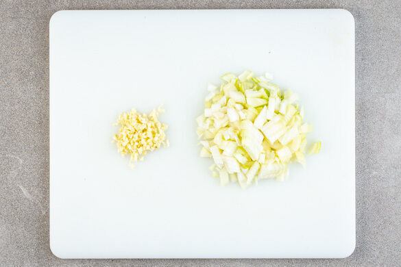 In einem mittelgroßen Topf ausreichend gesalzenes Wasser für die Pasta zum Kochen bringen. Die Zwiebel und den Knoblauch schälen, halbieren und in feine Würfel schneiden. Die Petersilie samt Stängeln fein hacken.
