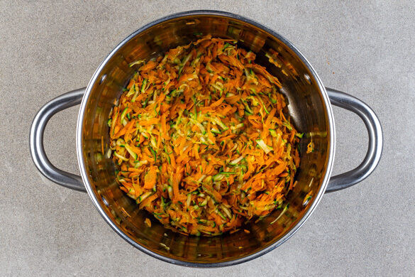 Die Zucchini mit einer Küchenreibe grob raspeln. Die Karotte ggf. schälen und ebenfalls grob reiben. Die Zucchini- und die Karottenraspel in dem Topf mit 2EL Olivenöl bei mittlerer Hitze 2–3Min. anbraten.