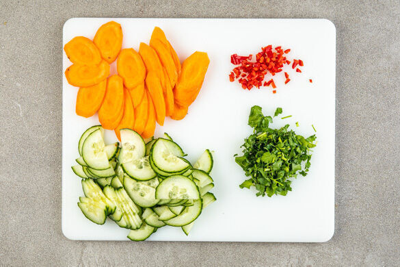 Die Karotten ggf. schälen und schräg in dünne Scheiben schneiden. Die Gurke längs halbieren und quer in schmale Scheiben schneiden. Die Peperoni längs halbieren und in feine Würfel schneiden. Tipp: Für weniger Schärfe die Kerne entfernen. Den Koriander samt Stängeln grob schneiden.