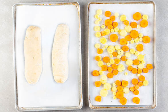 Die Karotten ggf. schälen, in dünne Scheiben schneiden und auf ein mit Backpapier ausgelegtes Backblech geben. Mit 1EL Pflanzenöl und je 1Prise Salz und Pfeffer vermengen, gleichmäßig verteilen und 15–20Min. auf der oberen Schiene im Ofen goldbraun rösten. Die Brötchen auf ein zweites Backblech geben und ca. 6Min. im Ofen aufbacken, dann etwas abkühlen lassen.